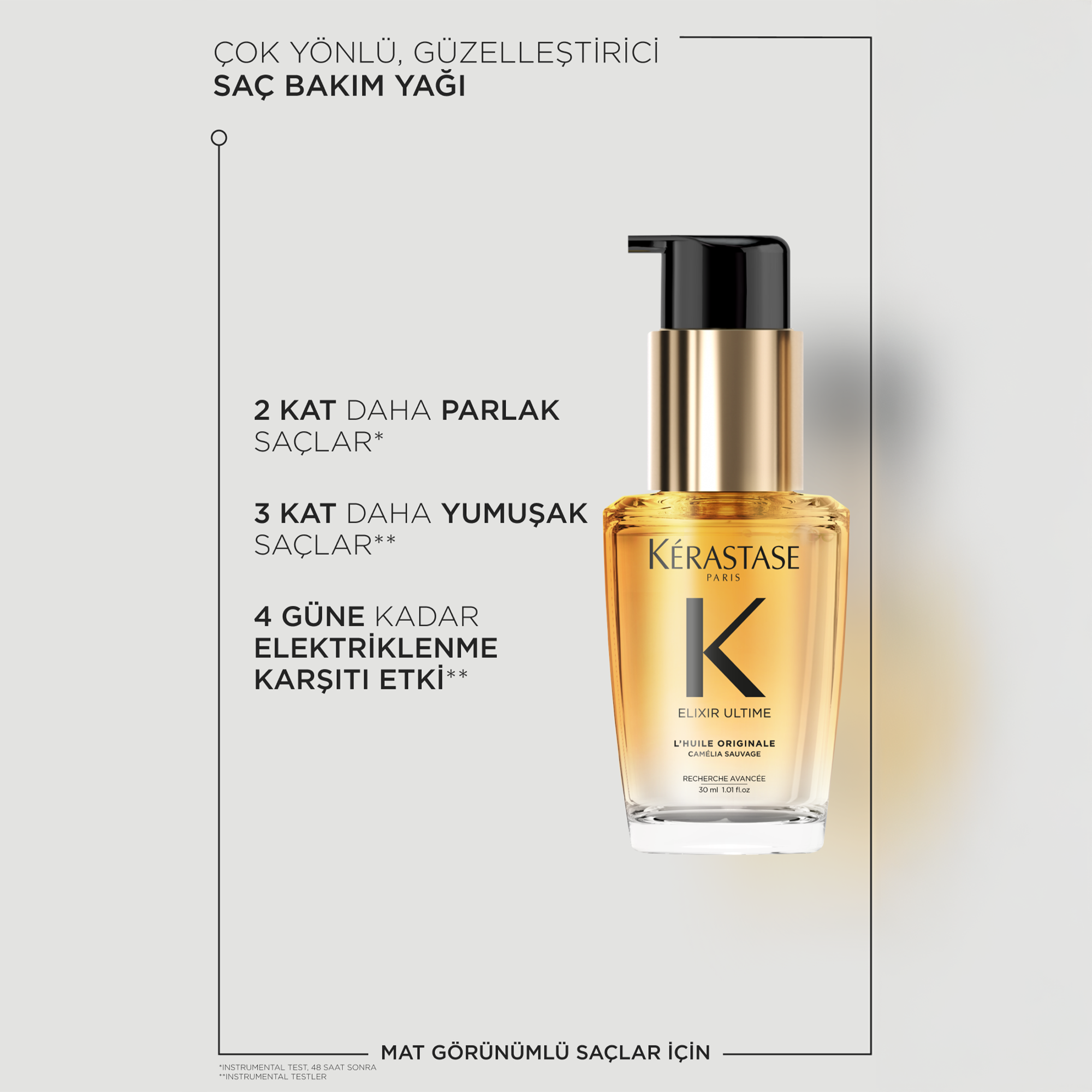 Kérastase Elixir Ultime Saç Bakım Yağı, lüksü sürdürülebilirlikle buluşturan eşsiz bir bakım deneyimi sunar. Fransız Kamelyası ve yabani Kamelya yağı gibi özenle seçilmiş içeriklerle zenginleştirilen bu ikonik yağ, tüm saç tipleri için idealdir.