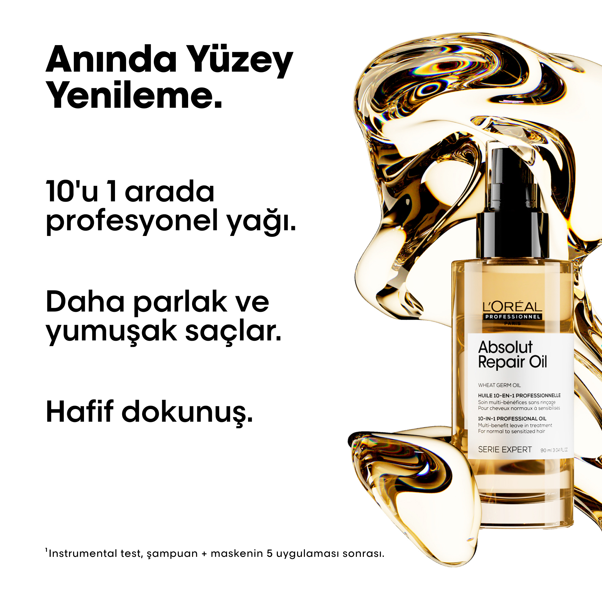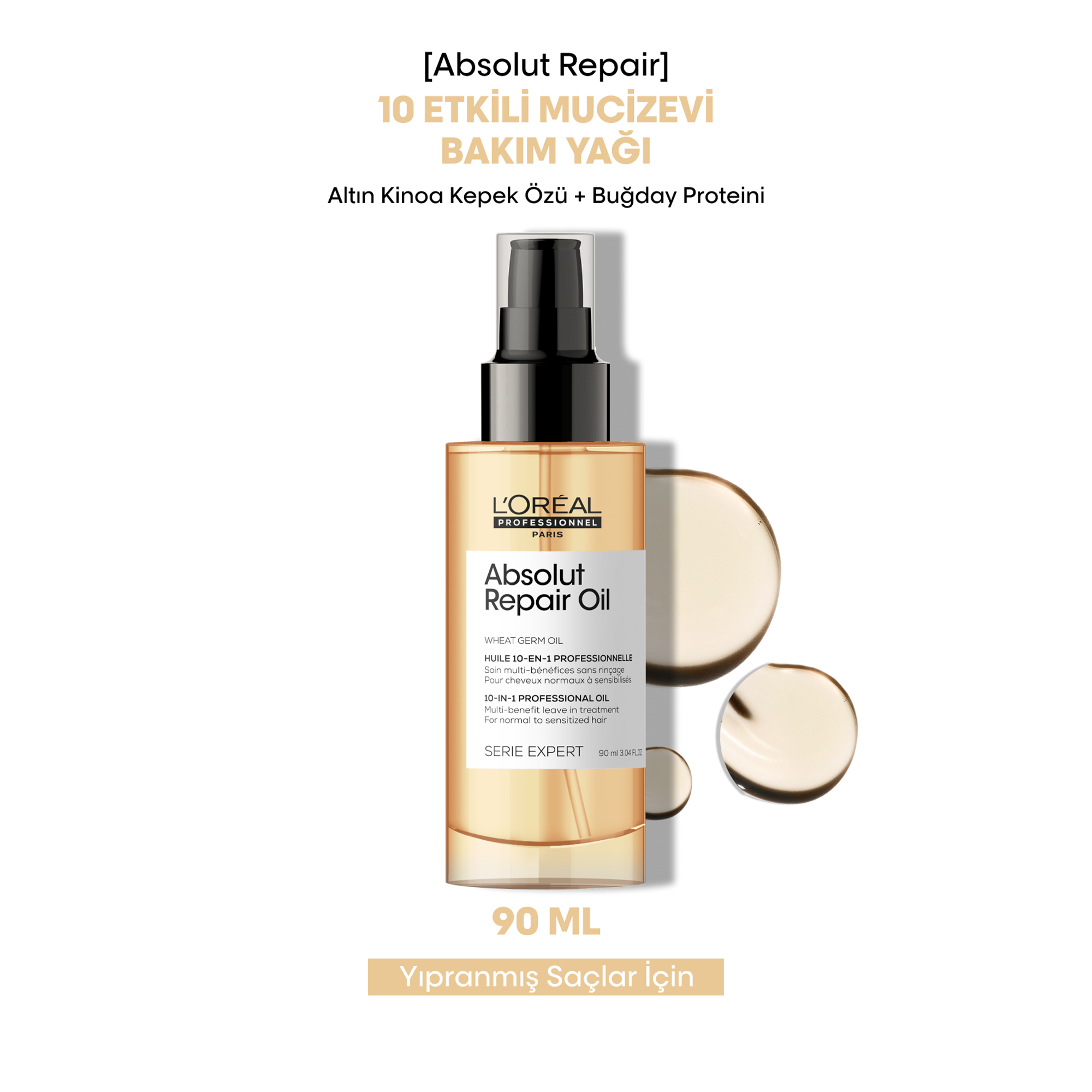 Loreal Professionnel Paris Serie Expert Absolut Repair yıpranmış saçlar için 10 etkili mucizevi bakım yağı, yoğun yıpranmış saçların onarımı için geliştirilmiş bu çok amaçlı bakım yağı, saçı kökten uca besleyerek onarır ve saçın yeniden yapılanmasına yardımcı olur. Hafif yapılı ve durulanmayan formülü sayesinde saçlarda ağırlık hissi bırakmadan ipeksi bir yumuşaklık ve parlaklık kazandırır.